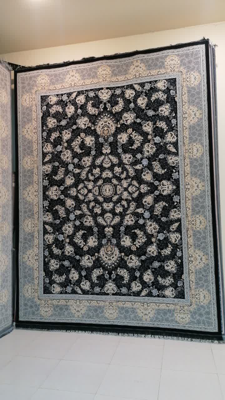 فرش دارای طراحی متقارن با مدالیون مرکزی دایرهای و نقوش گلدار و هندسی در اطراف آن است. زمینهی اصلی فرش به رنگ مشکی یا سرمهای تیره است که با جزئیات روشن در رنگهای کرم، بژ و آبی ملایم تزئین شده. این تضاد رنگی باعث برجسته شدن طرحها و ایجاد حس شکوه و عمق در فضا میشود. حاشیهی فرش با قابهای روشن و نقوش پیچکی، طرح مرکزی را قاببندی کرده و انسجام بصری را تقویت میکند.
