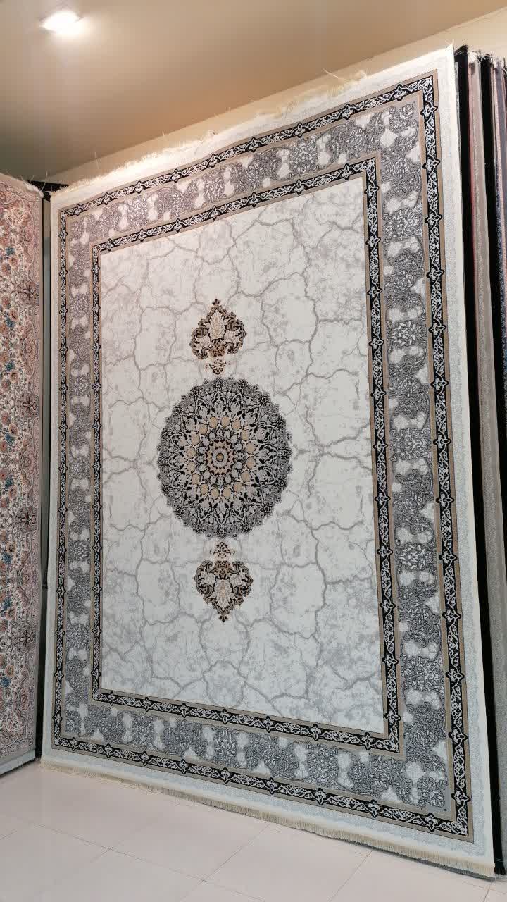 این فرش با طراحی متقارن و سه مدالیون دایرهای در امتداد محور عمودی، جلوهای منظم و چشمنواز دارد. مدالیون مرکزی با نقوش گلدار و هندسی در رنگهای مشکی، طوسی و بژ تزئین شده و دو مدالیون مشابه در بالا و پایین آن، ترکیب بصری را کامل میکنند. زمینهی فرش دارای بافتی شبیه سنگ مرمر با رگههای لطیف است که حس لوکس و مدرن را منتقل میکند. حاشیهها با قابهای مشکی و سفید و خطوط بژ، طراحی را قاببندی کردهاند و انسجام کلی را افزایش دادهاند.